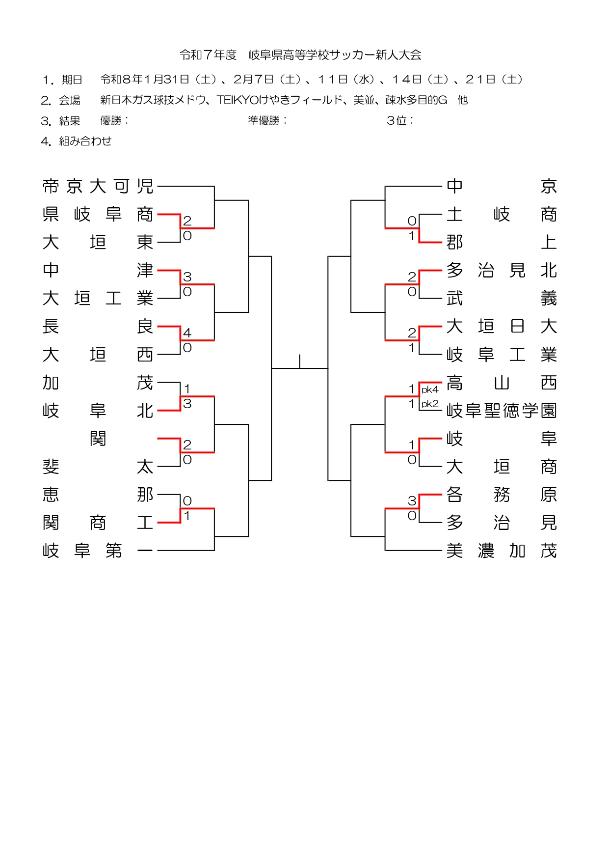 それでは、ここで 岐阜県高校サッカー新人大会の試合速報(結果速報)をお届けします。